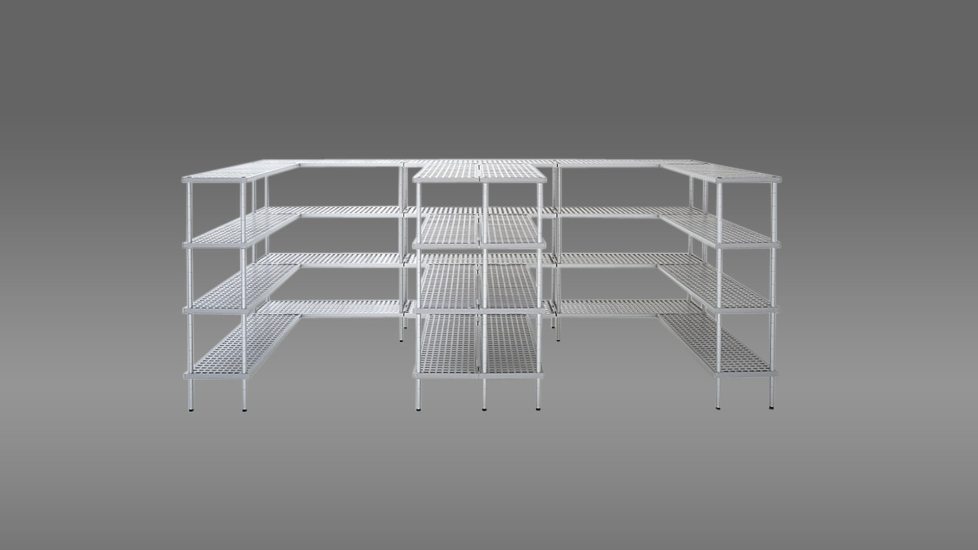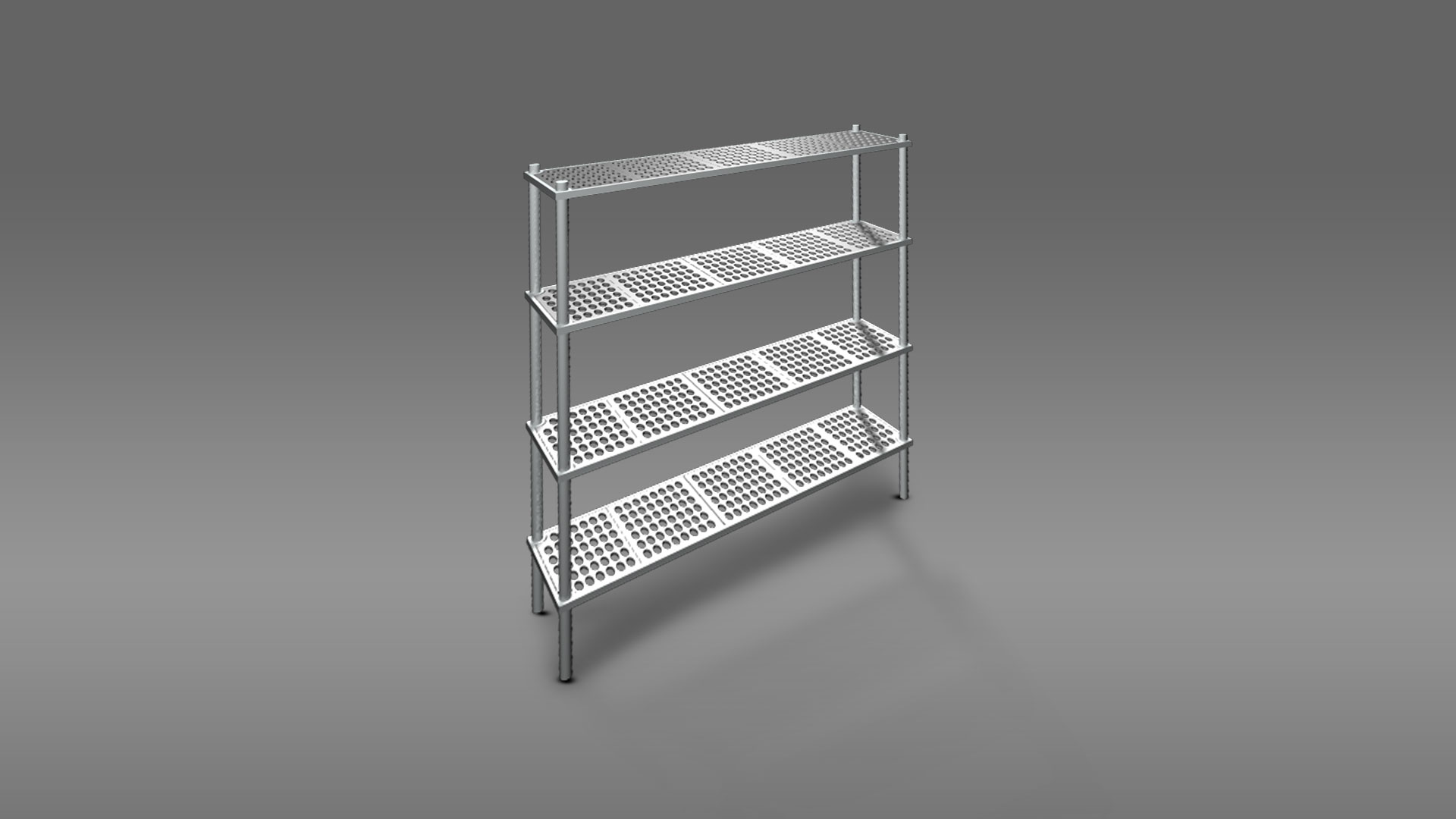 Ogni scaffalatura è composta da 4 montanti a sezione tonda da 35 mm, in alluminio e ripiani con lunghezze disponibili dai 600 mm ai 2000 mm (con escursione di 100 mm).